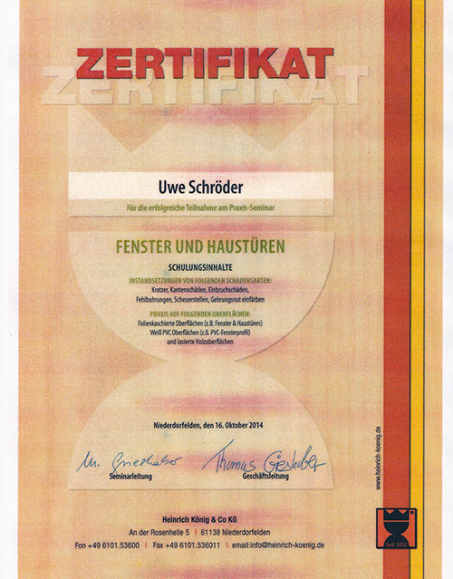Wir verwenden modernste Techniken zur Beseitigung von Schäden an Fenster und Türen: Das Verfüllen von Rissen und Dellen, die Bearbeitung mit Kunststoffausgleichmasse, Wärmebehandlung von Kunststoffflächen, Beilackierung auch verschiedenster Weißtöne und RAL-Töne, sowie Foliensanierung.