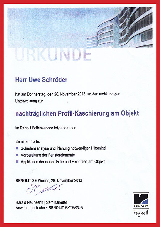 Wir bieten Ihnen für jede Art von Schaden an folierten Profilen eine schnelle Lösung, egal ob Transportschaden, Reinigungsfehler, Einbruchschaden, Verarbeitungsfehler
